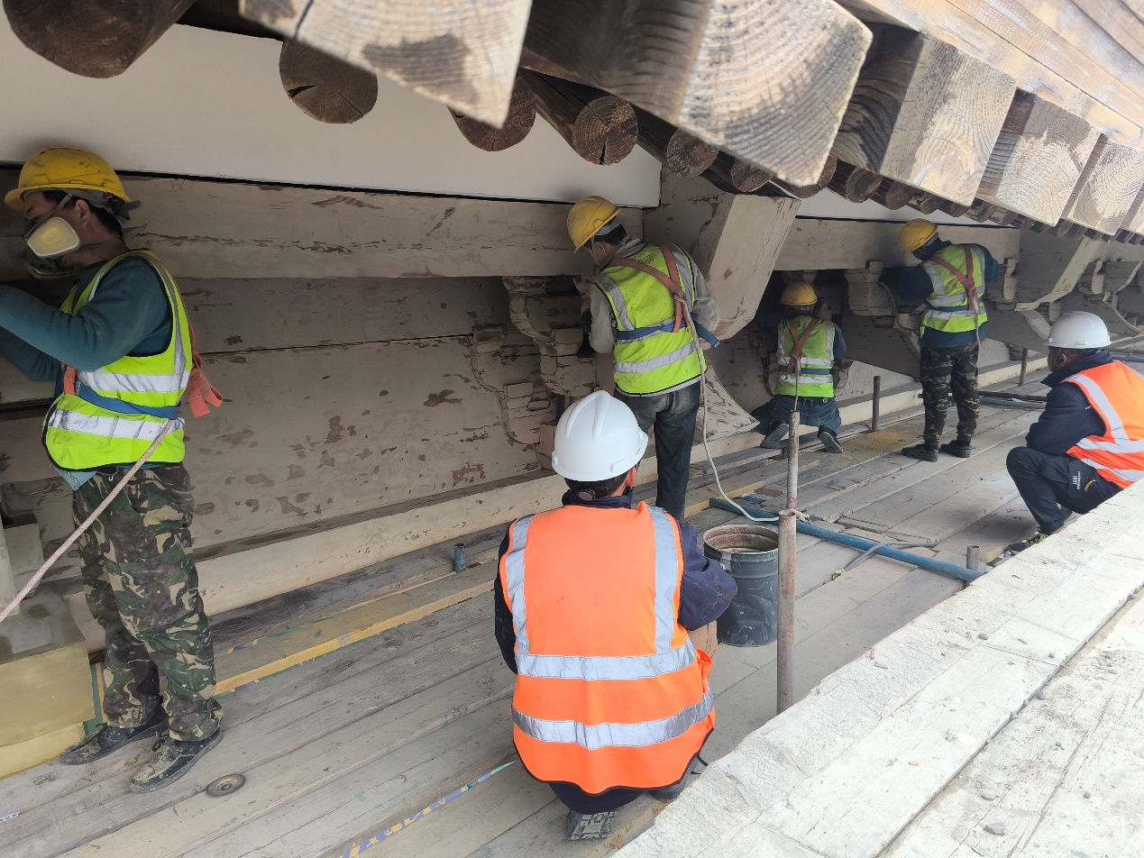 為保證項目實施進度,晨光藝術工程哈爾濱藥師寶殿維修項目的工作人員放棄與家人團聚的機會,堅守在自己的工作崗位上,他們穿梭在施工現場,進行斗拱打磨和墻體彩繪,一絲不茍地打磨,一筆一劃地描繪,在古建筑修復的現場,航天晨光人用自己的雙手和汗水保障項目按期推進。