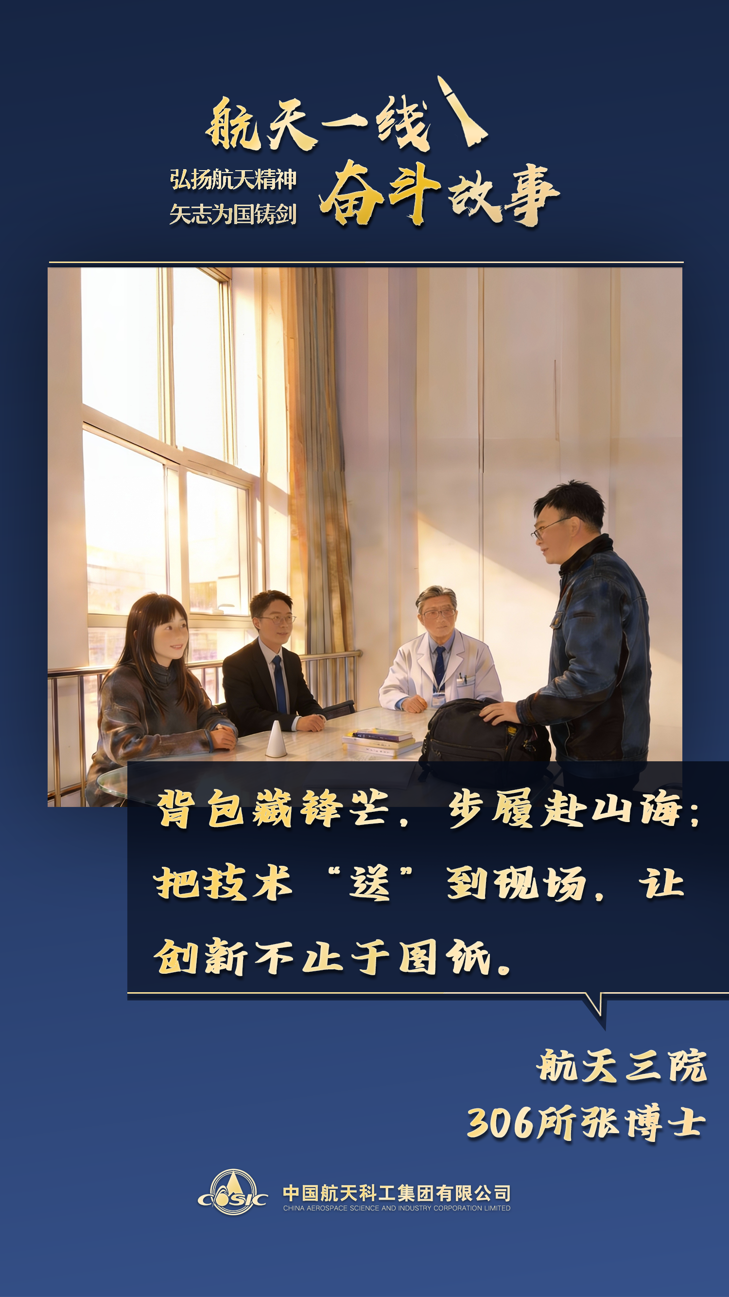 初見張博士,他確實如同事描述的那般內斂寡言,問及個人成績時,總是擺擺手說:“都是團隊的功勞”。可當我們聊起背包里的樣品、資料時,他的話匣子瞬間被打開。那一刻,我看到的不僅是一位科研工作者的專業,更是對自己事業的極致珍視。最讓我動容的,是他聊起“技術推廣”時的真誠。很多人覺得,理工男就該待在實驗室里“兩耳不聞窗外事”,但張博士打破了這種刻板印象。張博士的背包里,裝著的不僅是當下的成果,更是航天技術未來的無限可能。而這份“把實驗室裝進行囊,把熱愛藏進細節”的堅守,正是我們航天人最動人的模樣。(文/李敬毓 海報/張彤、杜宜桓)